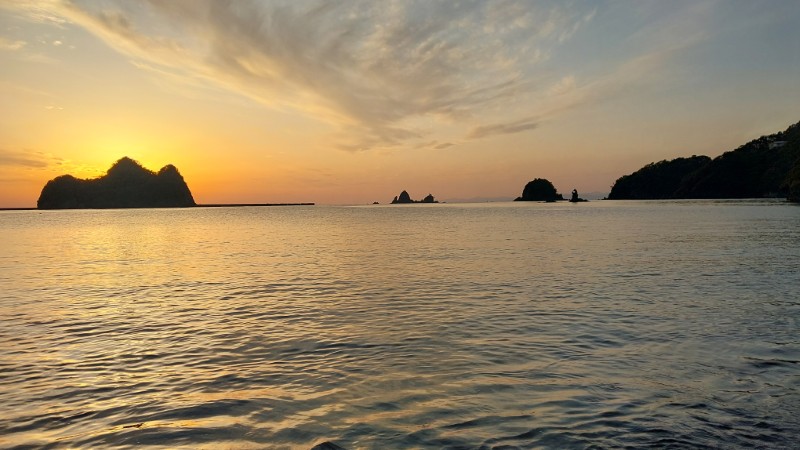 沖に見える小島と夕陽のコントラストが綺麗でした。