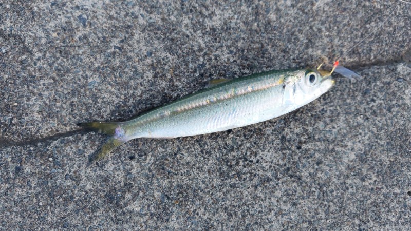 しばらくコマセを撒きながら待っていると小さいイワシ(カタボシイワシ?)が最初に掛かりました。